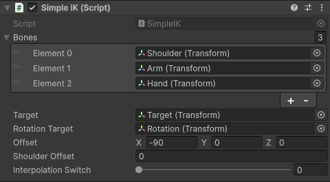 Where do we start? First, the script SimpleIK.cs needs to be added to an object in the scene.